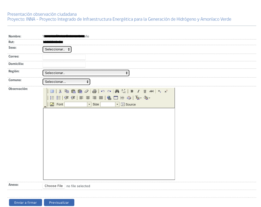 El organismo del Sistema de Evaluación e Impacto Ambiental del gobierno de Chile, ha abierto la participación ciudadana para que la población en Chile se manifieste acerca del Proyecto INNA.